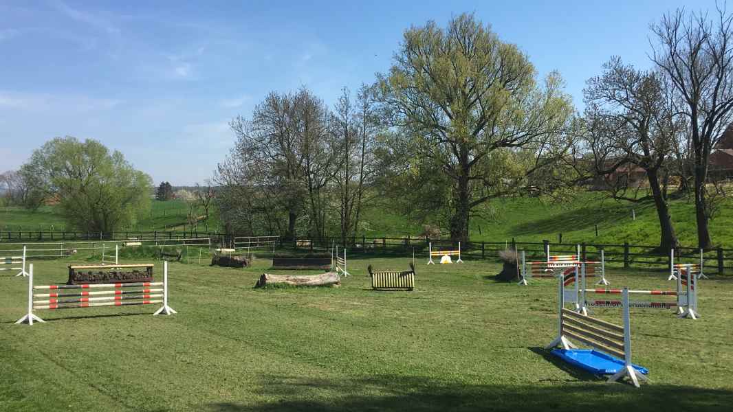 Der Grasspringplatz (40 x 60 m) wird jährlich gesandet, so dass der Boden sehr griffig ist, bei trocknem Wetter nicht zu fest und bei Regen nicht zu glatt. Neben Stangenhindernissen befinden sich diverse Geländesprünge auf dem Platz.